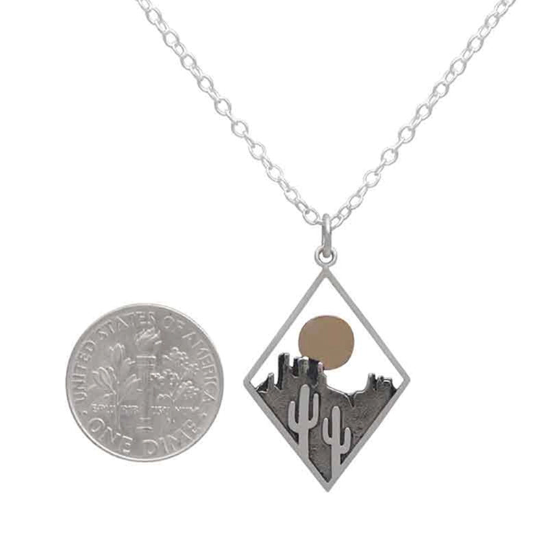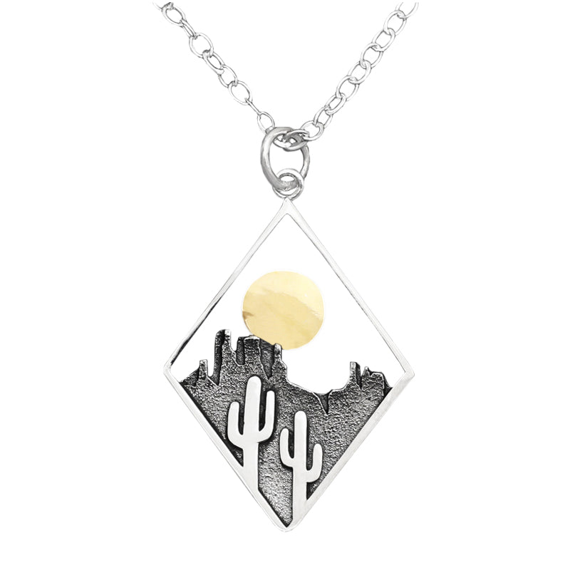 “ You can almost feel the warmth from this sterling silver cactus necklace with bronze sun. The mixed metal layered cactus pendant features shiny silver cacti, with textured silver landscape and a brilliant bronze sun. It's easy to get lost in its details, from the warm sun hanging low over the desert mountains to the saguaro cacti in the foreground. Desert landscapes are some of the most unique on our planet, from their vegetation, wildlife, canyons, and amazing colors."