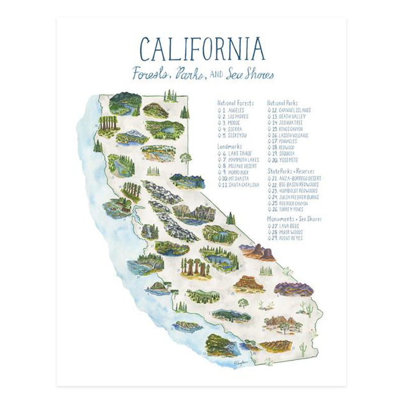 "This California Parks Map Checklist Illustration print features charted forests, landmarks, national parks, state parks/reserves, monuments + seashores and are original hand painted illustrations by the artist. There is also a checklist of 29 places with a tree next to each name for you to shade in the places you have been too. The corresponding number is next to each illustration. Frame is not included."