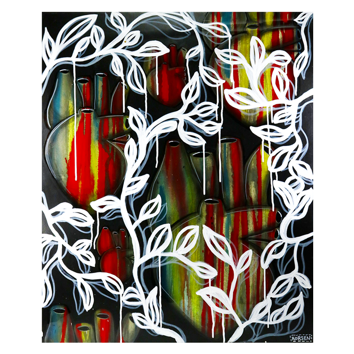 Jennifer Korsen is an LA based artist that works with mixed media pieces, murals, and street installations that can be seen regularly around Los Angeles in galleries, pop up shows, and public spaces. Besides LA her work has been shown in Portland, Seattle, New York, Germany, The UK, and more. She is most known for her heart series.