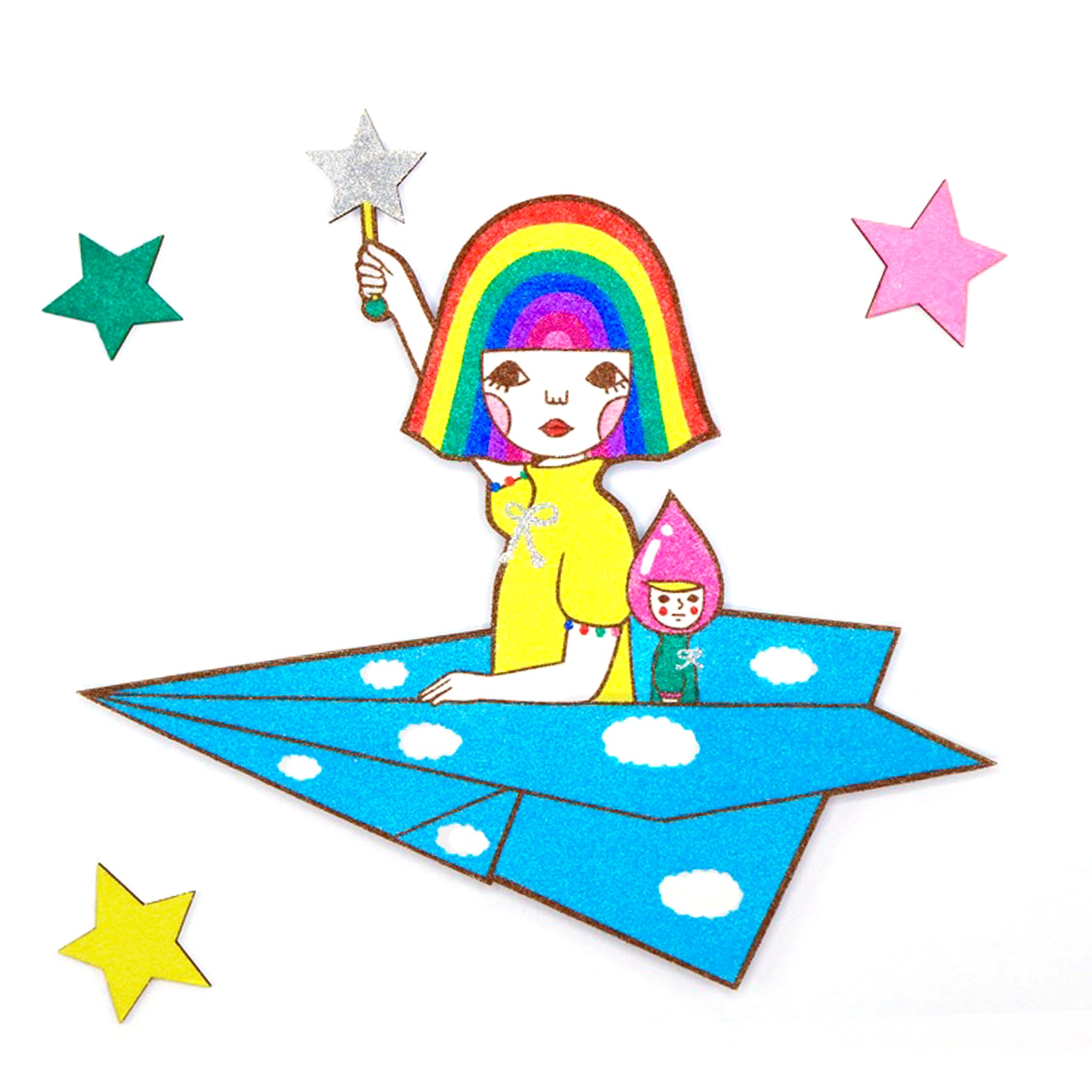 "Naoshi depicts cartoon-like characters in her imaginary candy colored pop and fantasy world inspired by manga (comic books) through the use of sand painting known as Sunae in Japanese. Sunae is comprised of brightly colored fine grain sand on adhesive paper, which can grow into installations. Although the process requires patience and precision, it evokes a childlike playfulness and joy within herself, which she hopes to share with her audience."